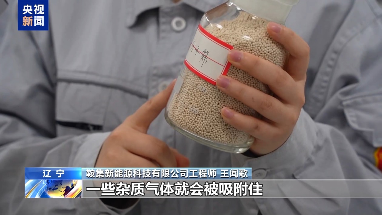 鞍集新能源科技有限公司工程师 王闻歌:核心就是靠这个新型分子筛。尾气通过分子筛,一些杂质气体就会被吸附住,只让氢气从分子筛微孔当中通过,能生成出纯度非常高的氢气,应用到电子制造、航空航天、高端化工等高精尖的产业领域。